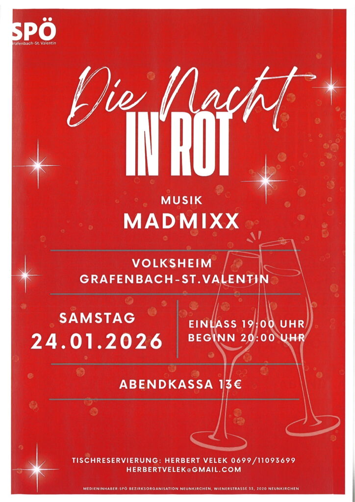 Die Nacht in Rot – Ball der SPÖ Januar 24 @ 19:0019:00 — 00:00 (5h) Volksheim Grafenbach, Schwarzastraße 58